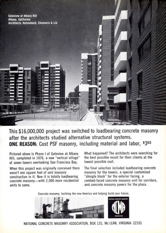Pictured above is Phase I of Gateview at Albany Hill, completed in 1976, a new "vertical village" of seven towers overlooking San Francisco Bay.