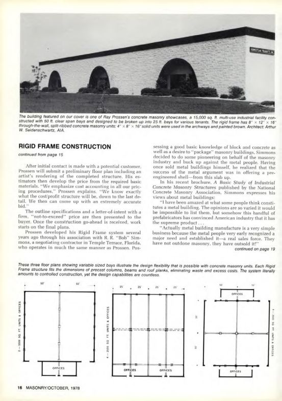Prossen developed his Rigid Frame system several years ago through his association with R. R. "Bob" Simmons, a negotiating contractor in Temple Terrace, Florida, who operates in much the same manner as Prossen. Possessing a good basic knowledge of block and concrete as well as a desire to "package" masonry buildings, Simmons decided to do some pioneering on behalf of the masonry industry and buck up against the metal people. Having once sold metal buildings himself, he realized that the success of the metal argument was in offering a pre-engineered shell-from this slab up.