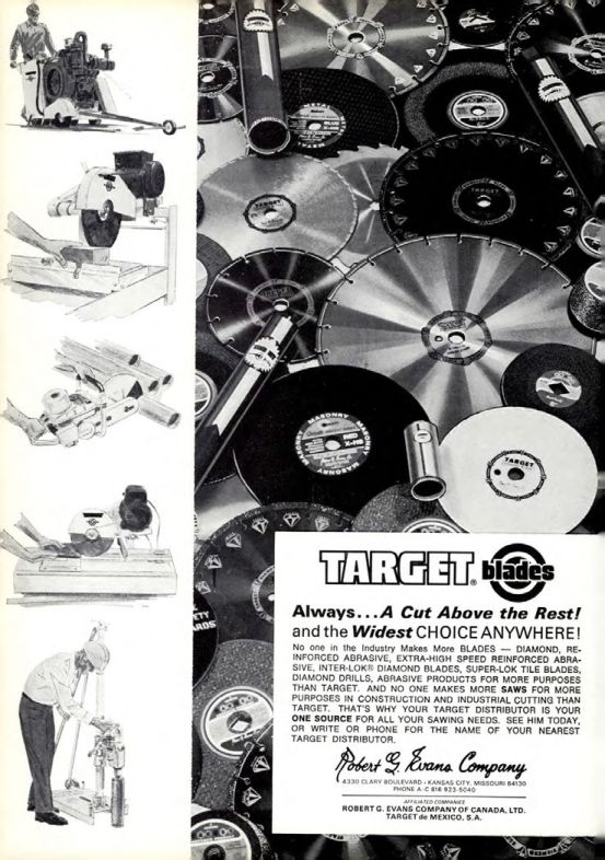 No one in the Industry Makes More BLADES DIAMOND, REINFORCED ABRASIVE, EXTRA-HIGH SPEED REINFORCED ABRASIVE, INTER-LOK® DIAMOND BLADES, SUPER-LOK TILE BLADES, DIAMOND DRILLS, ABRASIVE PRODUCTS FOR MORE PURPOSES THAN TARGET. AND NO ONE MAKES MORE SAWS FOR MORE PURPOSES IN CONSTRUCTION AND INDUSTRIAL CUTTING THAN TARGET. THAT'S WHY YOUR TARGET DISTRIBUTOR IS YOUR ONE SOURCE FOR ALL YOUR SAWING NEEDS. SEE HIM TODAY, OR WRITE OR PHONE FOR THE NAME OF YOUR NEAREST TARGET DISTRIBUTOR.