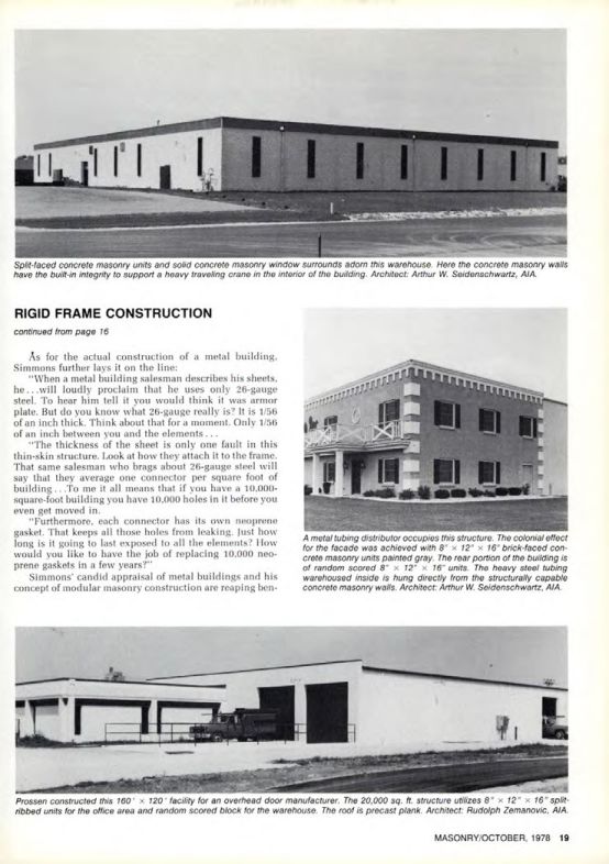 A metal tubing distributor occupies this structure. The colonial effect for the facade was achieved with 8"x 12"x16" brick-faced concrete masonry units painted gray. The rear portion of the building is of random scored 8" x 12" x 16" units. The heavy steel tubing warehoused inside is hung directly from the structurally capable concrete masonry walls. Architect: Arthur W. Seidenschwartz, AIA.