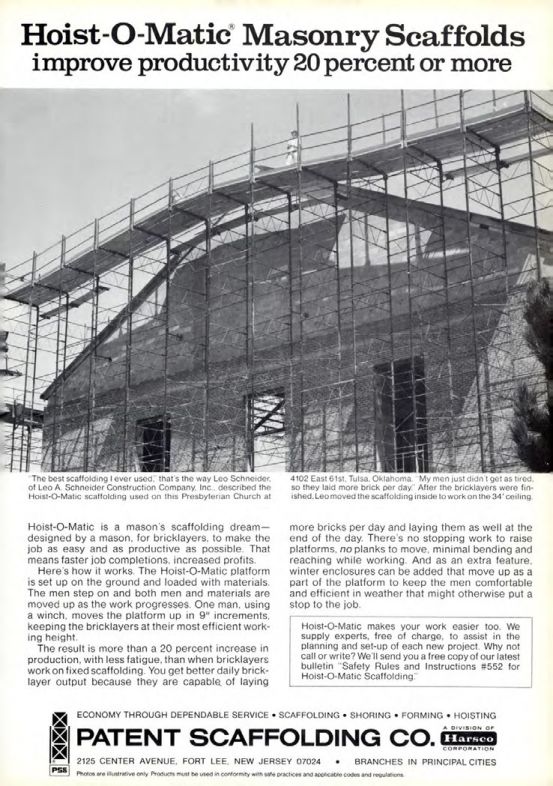 Hoist-O-Matic makes your work easier too. We supply experts, free of charge, to assist in the planning and set-up of each new project. Why not call or write? We'll send you a free copy of our latest bulletin "Safety Rules and Instructions #552 for Hoist-O-Matic Scaffolding."