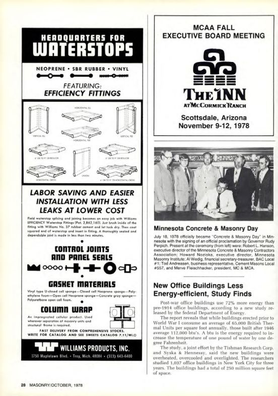 July 18, 1978 officially became "Concrete & Masonry Day" in Minnesota with the signing of an official proclamation by Governor Rudy Perpich. Present at the ceremony (from left) were: Robert L. Hanson, executive director of the Minnesota Concrete & Masonry Contractors Association: Howard Noziska, executive director, Minnesota Masonry Institute; Al Wedig, financial secretary-treasurer, BAC Local #1: Tod Andreasen, business representative, Cement Masons Local #557, and Merve Fleischhacker, president, MC & MCA.