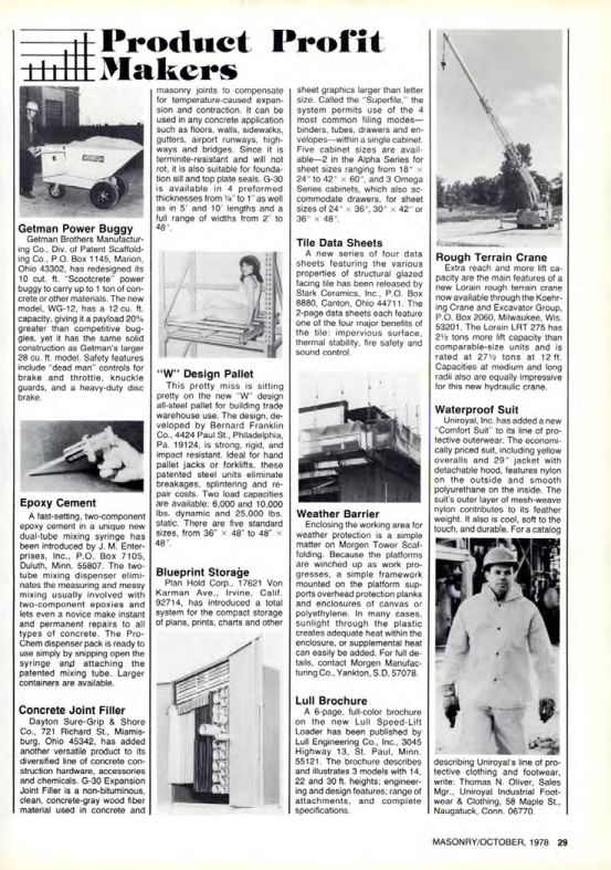 Getman Brothers Manufacturing Co., Div. of Patent Scaffolding Co., P.O. Box 1145, Marion, Ohio 43302, has redesigned its 10 cut. ft. "Scootcrete" power buggy to carry up to 1 ton of concrete or other materials. The new model, WG-12, has a 12 cu. ft. capacity, giving it a payload 20% greater than competitive buggies, yet it has the same solid construction as Getman's larger 28 cu. ft. model. Safety features include "dead man" controls for brake and throttle, knuckle guards, and a heavy-duty disc brake.