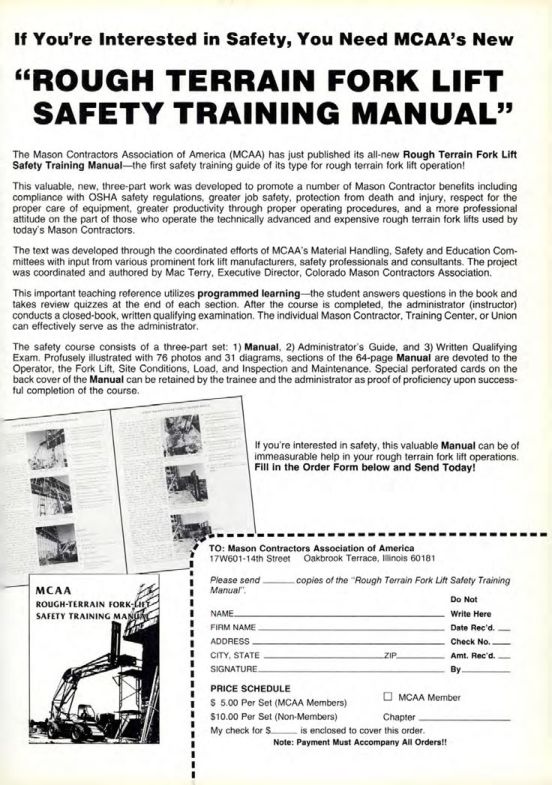 This valuable, new, three-part work was developed to promote a number of Mason Contractor benefits including compliance with OSHA safety regulations, greater job safety, protection from death and injury, respect for the proper care of equipment, greater productivity through proper operating procedures, and a more professional attitude on the part of those who operate the technically advanced and expensive rough terrain fork lifts used by today's Mason Contractors.