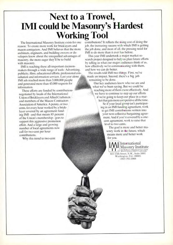 These efforts are funded by contributions negotiated by locals of the International Union of Bricklayers and Allied Craftsmen and members of the Mason Contractors Association of America. A penny, or two cents, for every hour worked by a brick layer covered by an agreement funding IMI-and that means 85 percent of the Union's membership-goes to support this aggressive promotion effort. And a large and growing number of local agreements now call for two-cent per hour contributions.