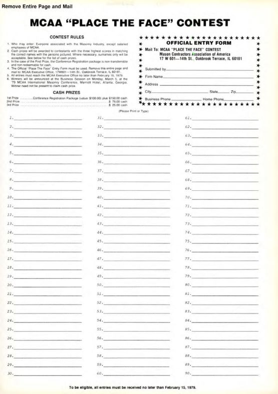 6. Winners will be announced at the Business Session on Monday, March 5, at the 79 MCAA International Masonry Conference, Marriott Hotel, Atlanta, Georgia. Winner need not be present to claim cash prize.