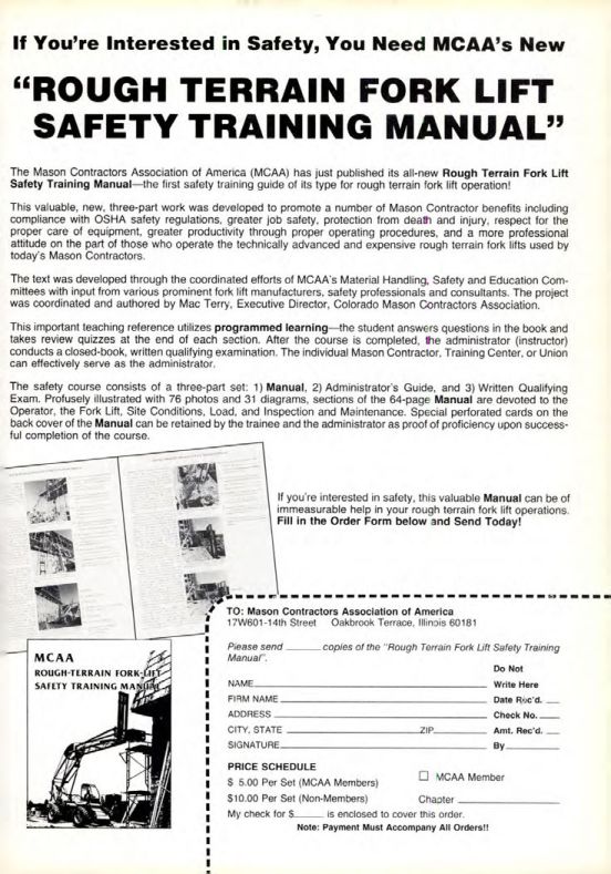 This valuable, new, three-part work was developed to promote a number of Mason Contractor benefits including compliance with OSHA safety regulations, greater job safety, protection from death and injury, respect for the proper care of equipment, greater productivity through proper operating procedures, and a more professional attitude on the part of those who operate the technically advanced and expensive rough terrain fork lifts used by today's Mason Contractors.