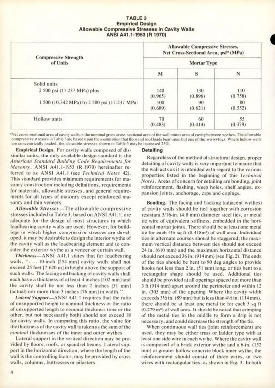 Empirical Design. For cavity walls composed of dissimilar units, the only available design standard is the American Standard Building Code Requirements for Masonry, ANSI A41.1-1953 (R 1970) hereinafter referred to as ANSI A41.1 (see Technical Notes 42). This standard provides minimum requirements for masonry construction including definitions, requirements for materials, allowable stresses, and general requirements for all types of masonry except reinforced masonry and thin veneers.