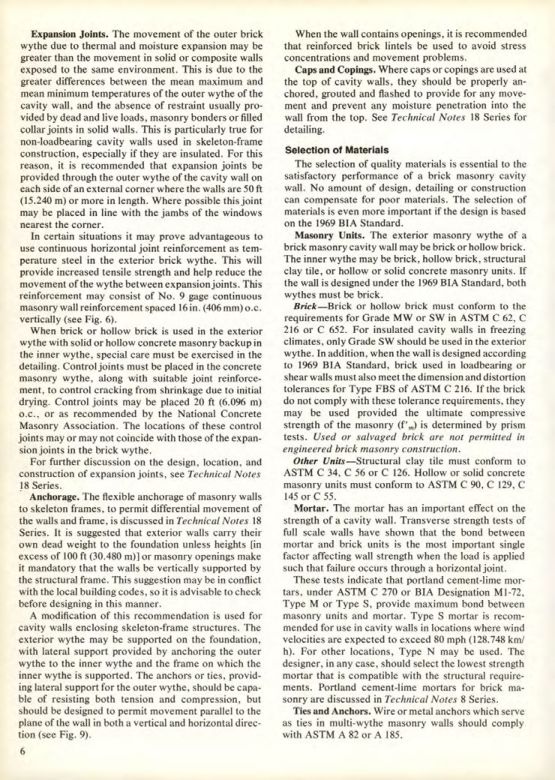 The selection of quality materials is essential to the satisfactory performance of a brick masonry cavity wall. No amount of design, detailing or construction can compensate for poor materials. The selection of materials is even more important if the design is based on the 1969 BIA Standard.