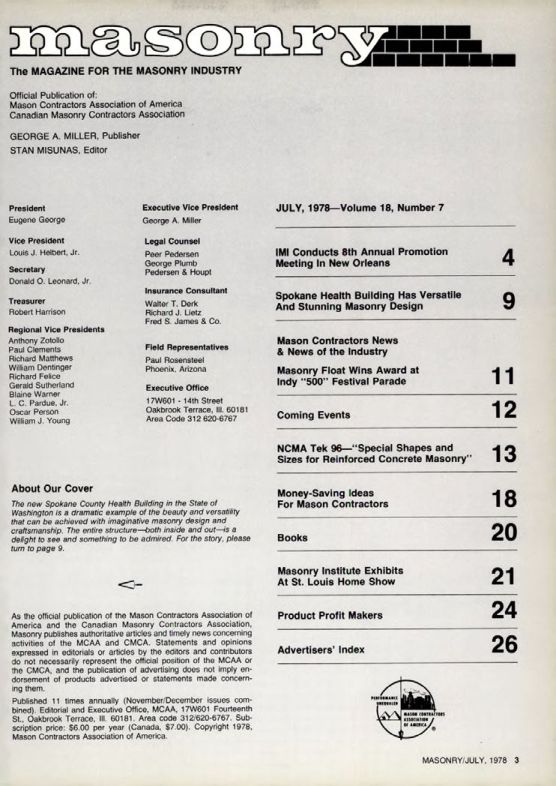 Published 11 times annually (November/December issues combined). Editorial and Executive Office, MCAA, 17W601 Fourteenth St.. Oakbrook Terrace, III. 60181. Area code 312/620-6767. Subscription price: $6.00 per year (Canada, $7.00). Copyright 1978, Mason Contractors Association of America.