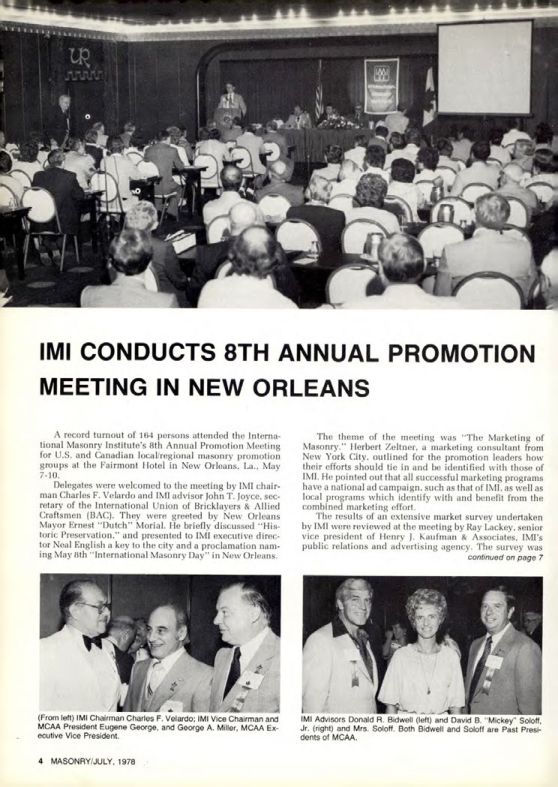The theme of the meeting was "The Marketing of Masonry." Herbert Zeltner, a marketing consultant from New York City, outlined for the promotion leaders how their efforts should tie in and be identified with those of IMI. He pointed out that all successful marketing programs have a national ad campaign, such as that of IMI, as well as local programs which identify with and benefit from the combined marketing effort.