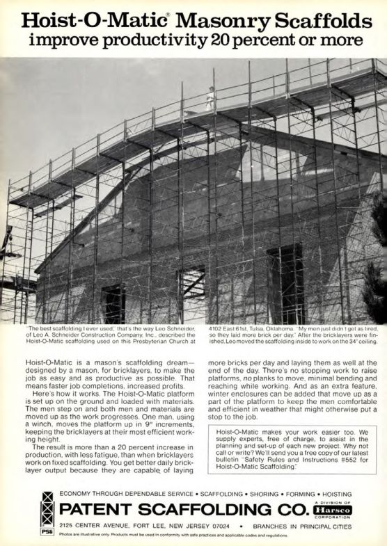 "The best scaffolding I ever used," that's the way Leo Schneider, of Leo A. Schneider Construction Company, Inc., described the Hoist-O-Matic scaffolding used on this Presbyterian Church at 4102 East 61st, Tulsa, Oklahoma. "My men just didn't get as tired, so they laid more brick per day." After the bricklayers were finished, Leo moved the scaffolding inside to work on the 34' ceiling.