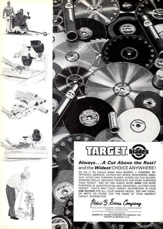 No one in the Industry Makes More BLADES DIAMOND, RE-INFORCED ABRASIVE, EXTRA-HIGH SPEED REINFORCED ABRASIVE, INTER-LOK® DIAMOND BLADES, SUPER-LOK TILE BLADES, DIAMOND DRILLS, ABRASIVE PRODUCTS FOR MORE PURPOSES THAN TARGET. AND NO ONE MAKES MORE SAWS FOR MORE PURPOSES IN CONSTRUCTION AND INDUSTRIAL CUTTING THAN TARGET. THAT'S WHY YOUR TARGET DISTRIBUTOR IS YOUR ONE SOURCE FOR ALL YOUR SAWING NEEDS. SEE HIM TODAY, OR WRITE OR PHONE FOR THE NAME OF YOUR NEAREST TARGET DISTRIBUTOR.
