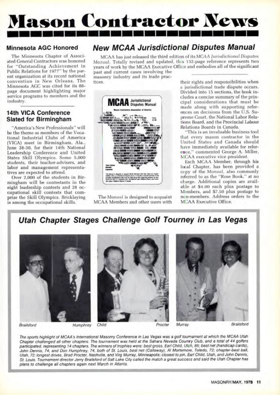 The sports highlight of MCAA's International Masonry Conference in Las Vegas was a golf tournament at which the MCAA Utah Chapter challenged all other chapters. The tournament was held at the Sahara Nevada Country Club, and a total of 44 golfers participated, representing 14 chapters. The winners of trophies were: best gross, Earl Child, Utah, 86; best net (handicap cards), John Dennis, 74, and Don Humphrey, 74, both of St. Louis, best net (Callaway). Al Mortemore, Toledo, 72; chapter-best ball, Utah, 72; longest drives, Brad Procter, Nashville, and Virg Murray, Minneapolis; closest to pin, Earl Child, Utah, and John Dennis, St. Louis. Tournament director Jerry Brailsford of Salt Lake City called the match a great success and said the Utah Chapter has plans to challenge all chapters again next March in Atlanta.