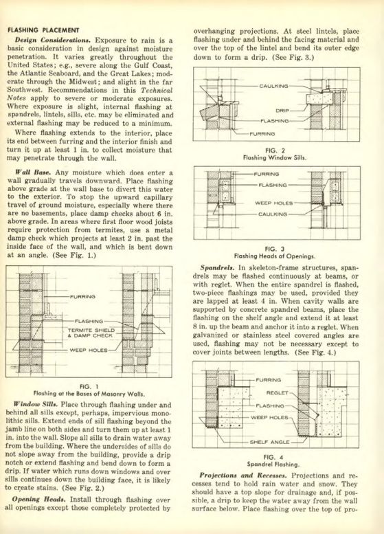 Design Considerations. Exposure to rain is a basic consideration in design against moisture penetration. It varies greatly throughout the United States; e.g., severe along the Gulf Coast, the Atlantic Seaboard, and the Great Lakes; moderate through the Midwest; and slight in the far Southwest. Recommendations in this Technical Notes apply to severe or moderate exposures. Where exposure is slight, internal flashing at spandrels, lintels, sills, etc. may be eliminated and external flashing may be reduced to a minimum.