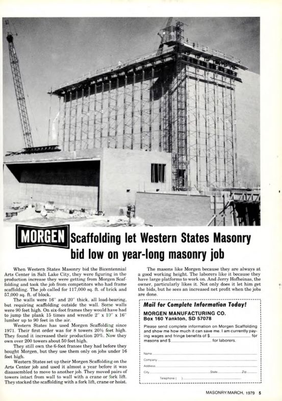 When Western States Masonry bid the Bicentennial Arts Center in Salt Lake City, they were figuring in the production increase they were getting from Morgen Scaffolding and took the job from competitors who had frame scaffolding. The job called for 117,000 sq. ft. of brick and 57,000 sq. ft. of block.