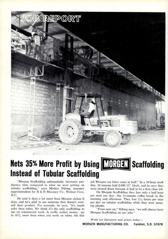 "Morgen Scaffolding substantially increases productive time compared to what we were getting on tubular scaffolding," says Mickey Nifong, masonry superintendent for R & B Masonry Co., Walnut Cove, N.C.