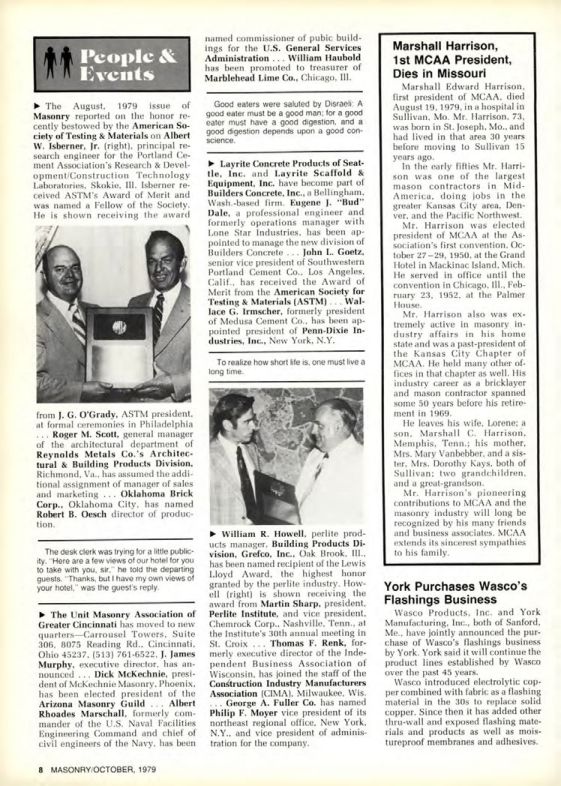 Mr. Harrison's pioneering contributions to MCAA and the masonry industry will long be recognized by his many friends and business associates. MCAA extends its sincerest sympathies to his family.