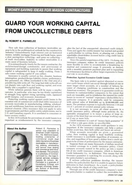 It is extraordinarily timely for the mason contractor, the architectural/design community, and provisioner of equipment and building materials to assure that working capital is safeguarded to keep it really working. From a sale comes working capital IF you collect.
