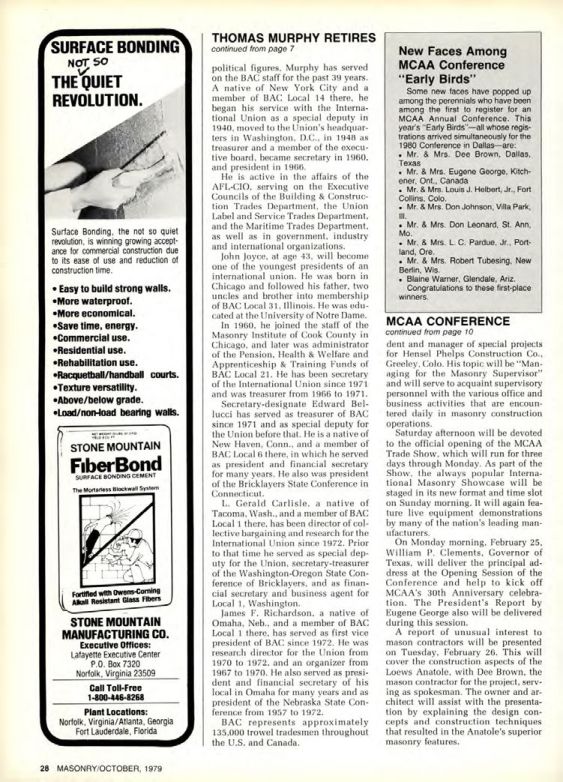 Political figures, Murphy has served on the BAC staff for the past 39 years. A native of New York City and a member of BAC Local 14 there, he began his service with the International Union as a special deputy in 1940, moved to the Union's headquarters in Washington, D.C., in 1948 as treasurer and a member of the executive board, became secretary in 1960, and president in 1966.