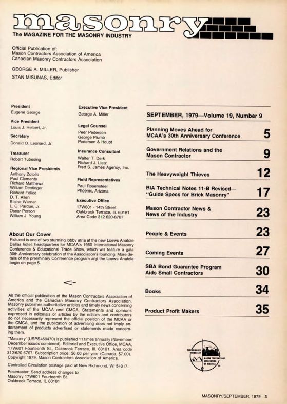 "Masonry" (USPS469470) is published 11 times annually (November/December issues combined). Editorial and Executive Office, MCAA, 17W601 Fourteenth St., Oakbrook Terrace, III. 60181. Area code 312/620-6767. Subscription price: $6.00 per year (Canada. $7.00). Copyright 1979, Mason Contractors Association of America.