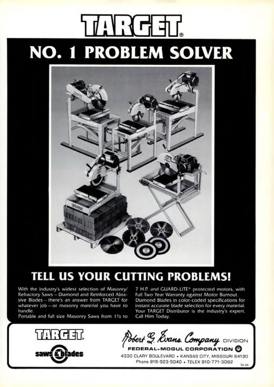With the industry's widest selection of Masonry/Refractory Saws - Diamond and Reinforced Abrasive Blades - there's an answer from TARGET for whatever job or masonry material you have to handle. Portable and full size Masonry Saws from 12 to 7 H.P. and GUARD-LITE protected motors, with Full Two Year Warranty against Motor Burnout. Diamond Blades in color-coded specifications for instant accurate blade selection for every material. Your TARGET Distributor is the industry's expert. Call Him Today.