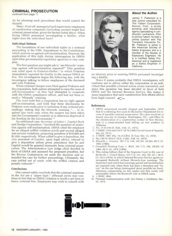 James T. Patterson is a loss control consultant for The Talbert Corporation, Denver, Colo., a surety bonding and insurance agency specializing in construction contractors. Prior to joining Talbert, he held a similar position with The Travelers Insurance Co. Mr. Patterson is active in the American Society of Safety Engineers and is a member of the Society of Explosives Engineers. He is a Certified Safety Professional and is registered as a Safety Engineer in California.