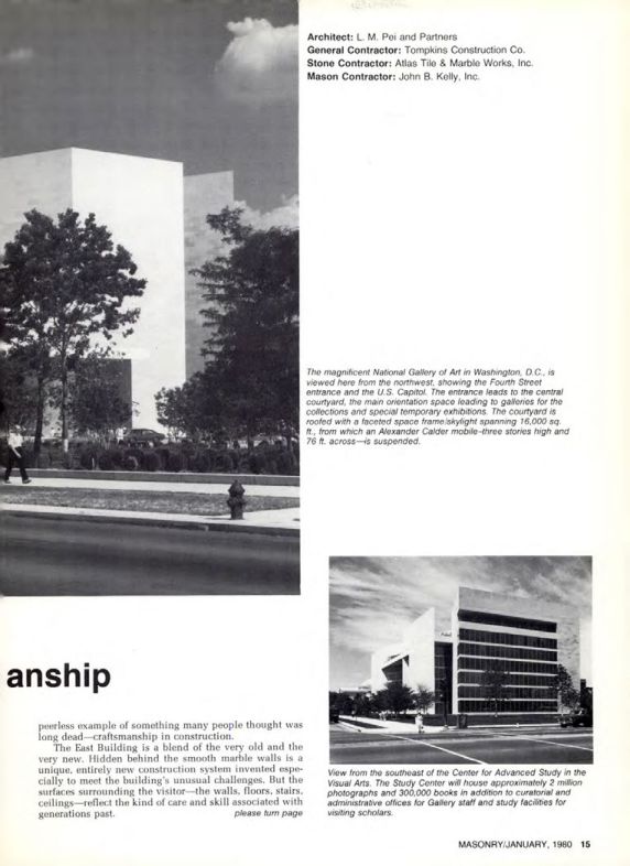 The East Building is a blend of the very old and the very new. Hidden behind the smooth marble walls is a unique, entirely new construction system invented especially to meet the building's unusual challenges. But the surfaces surrounding the visitor-the walls, floors, stairs, ceilings-reflect the kind of care and skill associated with generations past.