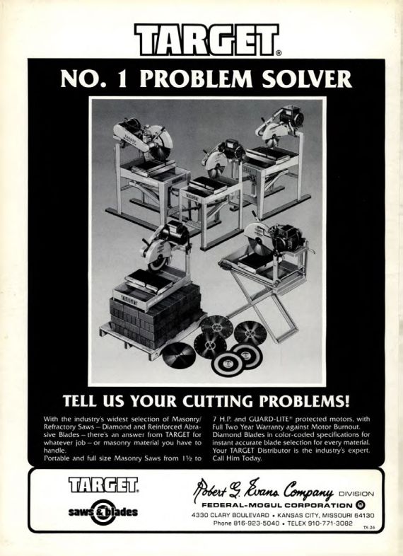 With the industry's widest selection of Masonry/Refractory Saws - Diamond and Reinforced Abrasive Blades there's an answer from TARGET for whatever job - or masonry material you have to handle. Portable and full size Masonry Saws from 1½ to 7 H.P. and GUARD-LITE protected motors, with Full Two Year Warranty against Motor Burnout. Diamond Blades in color-coded specifications for instant accurate blade selection for every material. Your TARGET Distributor is the industry's expert. Call Him Today.