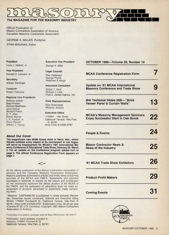 The magnificent new MGM Grand Hotel in Reno, Nev., which literally outdoes every aspect of its counterpart in Las Vegas, will serve as headquarters for MCAA's 1981 International Masonry Conference & Educational Trade Show, February 26-March 3. For an update on the Conference program, please turn to page 9. The official Conference Registration Form appears on page 7.