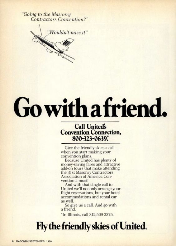 Give the friendly skies a call when you start making your convention plans. Because United has plenty of money-saving fares and attractive add-on tours that make attending the 31st Masonry Contractors Association of America Convention a must! And with that single call to United we'll not only arrange your flight reservations, but your hotel accommodations and rental car as well. So give us a call. And go with a friend. *In Illinois, call 312-569-3375.