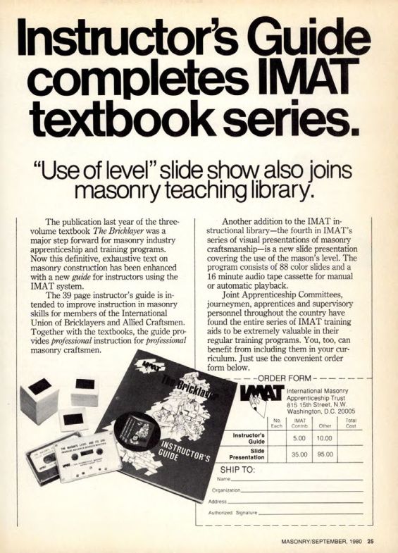 The publication last year of the three-volume textbook *The Bricklayer* was a major step forward for masonry industry apprenticeship and training programs. Now this definitive, exhaustive text on masonry construction has been enhanced with a new guide for instructors using the IMAT system.