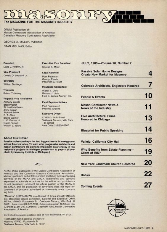 Passive solar-perhaps the two biggest words in energy-conscious America today. To learn what progressive architects and mason contractors are doing to implement solar energy in two residential projects in Michigan, please turn to page 4. (Cover photo by Masonry Institute of Michigan.)