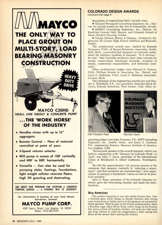 The keynote speaker at the awards banquet, which was held in conjunction with "Masonry In Colorado Week" in April, was John T. Joyce, president of the International Union of Bricklayers & Allied Craftsmen. Washington. D.C.