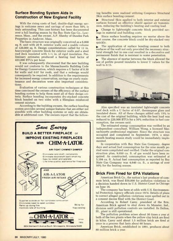 Evaluation of various construction techniques at this time convinced the owners of the efficiency of the surface bonding system to help them meet all of their design criteria. Surface bonding incorporates dry-stacked concrete block bonded on two sides with a fiberglass reinforced cement mixture.