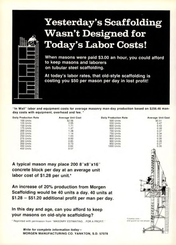 When masons were paid $3.00 an hour, you could afford to keep masons and laborers on tubular steel scaffolding. At today's labor rates, that old-style scaffolding is costing you $50 per mason per day in lost profit!