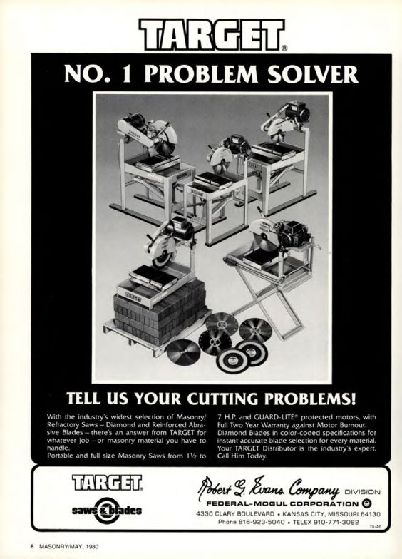 Portable and full size Masonry Saws from 1½ to 7 H.P. and GUARD-LITE protected motors, with Full Two Year Warranty against Motor Burnout. Diamond Blades in color-coded specifications for instant accurate blade selection for every material. Your TARGET Distributor is the industry's expert. Call Him Today.