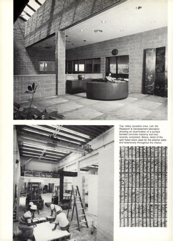 Top, lobby reception area. Left, the Research & Development laboratory showing an examination of a surface bonded concrete masonry wall test, recently completed. Below, detail of the split fluted block used for the exterior walls and extensively throughout the interior.