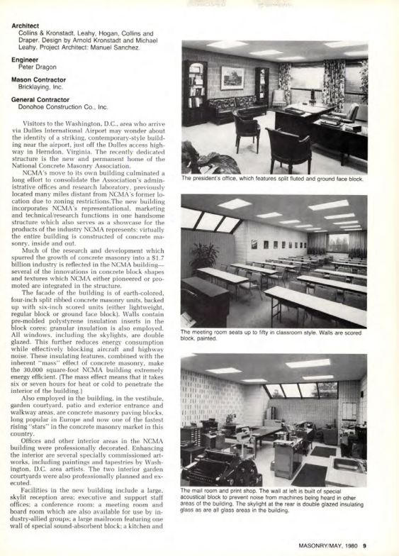 NCMA's move to its own building culminated a long effort to consolidate the Association's administrative offices and research laboratory, previously located many miles distant from NCMA's former location due to zoning restrictions. The new building incorporates NCMA's representational, marketing and technical/research functions in one handsome structure which also serves as a showcase for the products of the industry NCMA represents: virtually the entire building is constructed of concrete masonry, inside and out.