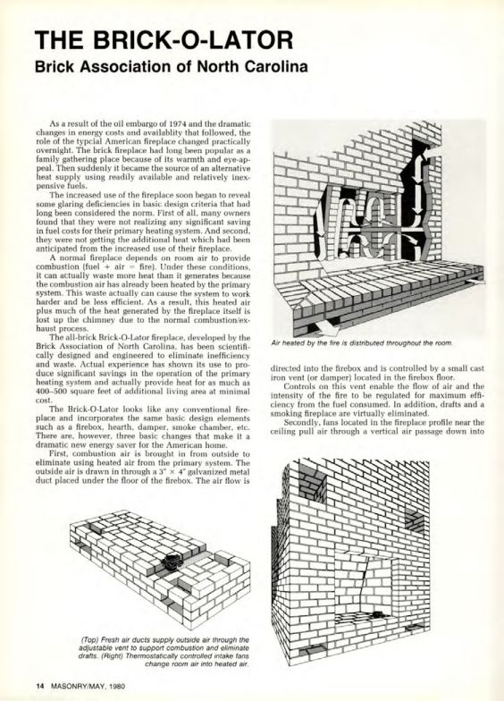 The all-brick Brick-O-Lator fireplace, developed by the Brick Association of North Carolina, has been scientifically designed and engineered to eliminate inefficiency and waste. Actual experience has shown its use to produce significant savings in the operation of the primary heating system and actually provide heat for as much as 400-500 square feet of additional living area at minimal cost.