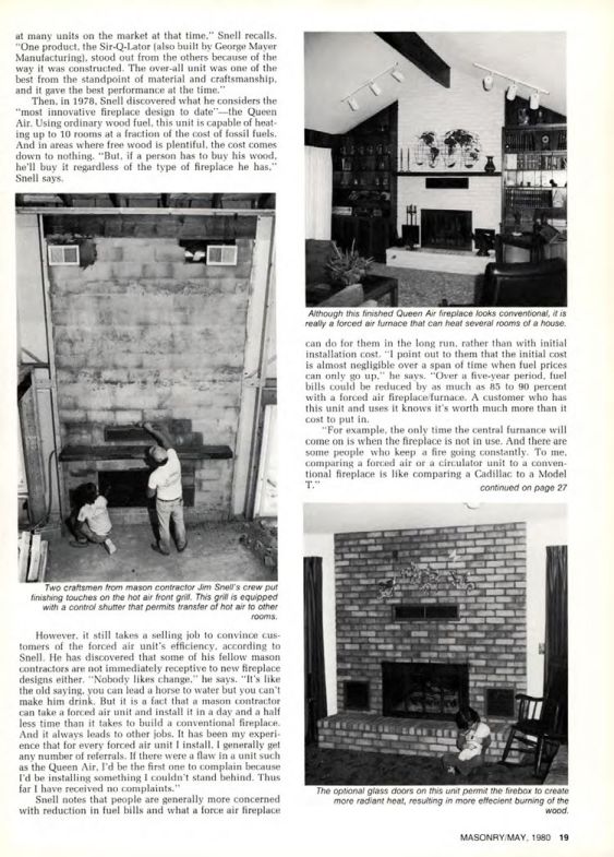 However, it still takes a selling job to convince customers of the forced air unit's efficiency, according to Snell. He has discovered that some of his fellow mason contractors are not immediately receptive to new fireplace designs either. "Nobody likes change," he says. "It's like the old saying, you can lead a horse to water but you can't make him drink. But it is a fact that a mason contractor can take a forced air unit and install it in a day and a half less time than it takes to build a conventional fireplace. And it always leads to other jobs. It has been my experience that for every forced air unit I install, I generally get any number of referrals. If there were a flaw in a unit such as the Queen Air, I'd be the first one to complain because I'd be installing something I couldn't stand behind. Thus far I have received no complaints."