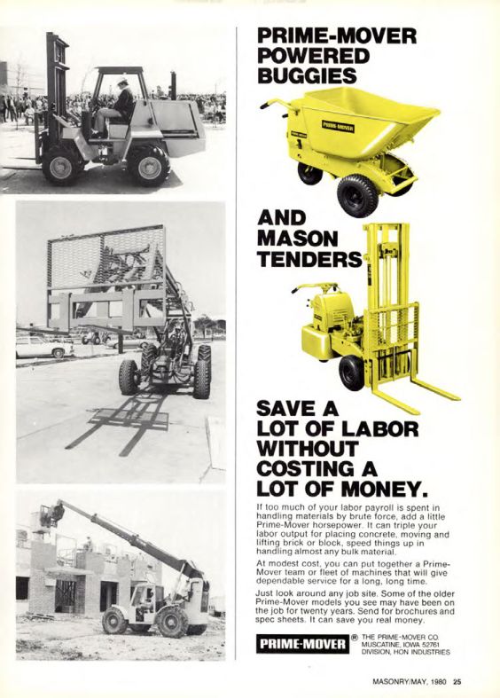If too much of your labor payroll is spent in handling materials by brute force, add a little Prime-Mover horsepower. It can triple your labor output for placing concrete, moving and lifting brick or block, speed things up in handling almost any bulk material.