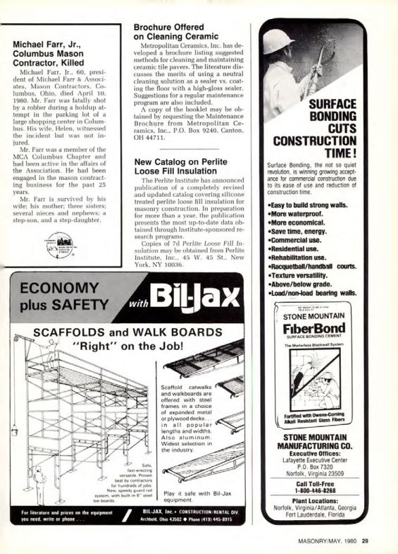Mr. Farr was a member of the MCA Columbus Chapter and had been active in the affairs of the Association. He had been engaged in the mason contracting business for the past 25 years.