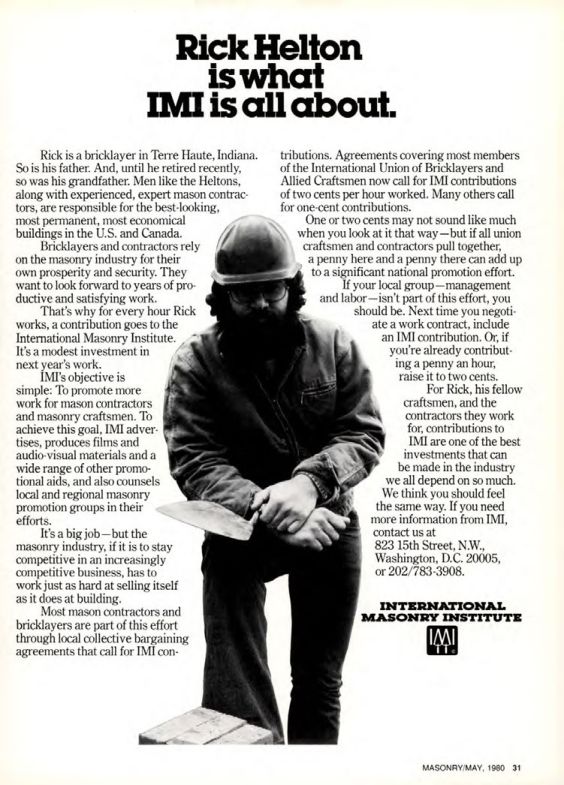 Most mason contractors and bricklayers are part of this effort through local collective bargaining agreements that call for IMI contributions. Agreements covering most members of the International Union of Bricklayers and Allied Craftsmen now call for IMI contributions of two cents per hour worked. Many others call for one-cent contributions.