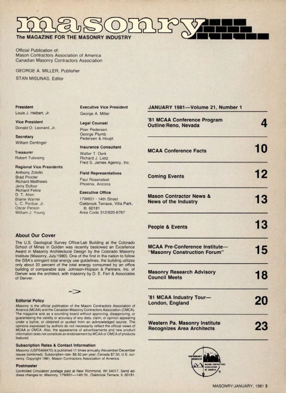 Masonry (USPS469470) is published 11 times annually (November December issues combined). Subscription rate: $6.50 per year; Canada $7.50, U.S. currency. Copyright 1981, Mason Contractors Association of America