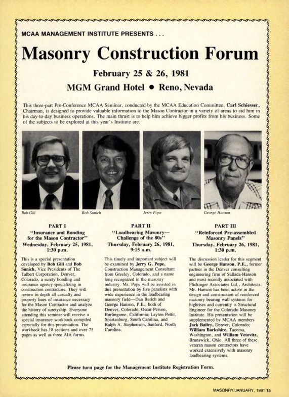 This timely and important subject will be examined by Jerry G. Pope, Construction Management Consultant from Greeley, Colorado, and a name long recognized in the masonry industry. Mr. Pope will be assisted in this presentation by five panelists with wide experience in the loadbearing masonry field-Dan Berich and George Hanson, P.E., both of Denver, Colorado; Oscar Person, Burlingame, California; Layton Pettit, Spartanburg, South Carolina, and Ralph A. Stephenson, Sanford, North Carolina.