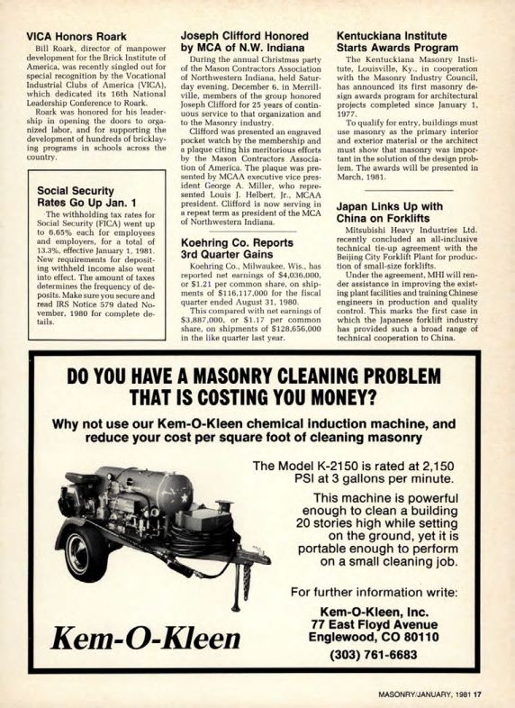 Why not use our Kem-O-Kleen chemical induction machine, and reduce your cost per square foot of cleaning masonry.