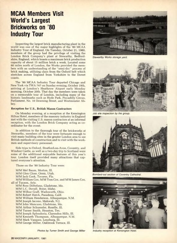 Inspecting the largest brick manufacturing plant in the world was one of the major highlights of the '80 MCAA Industry Tour of England. On Tuesday, October 21, 1980, members of the group had the privilege of visiting the London Brick Company's plant at Stewartby, Bedfordshire, England, which boasts a maximum brick production capacity of about 15 million brick a week. Located some 60 miles north of London, the Works provided the members with an understanding of the "semi-dry" process of brick making, utilizing clays from the Oxford belt which stretches across England from Yorkshire to the Dorset coasts.