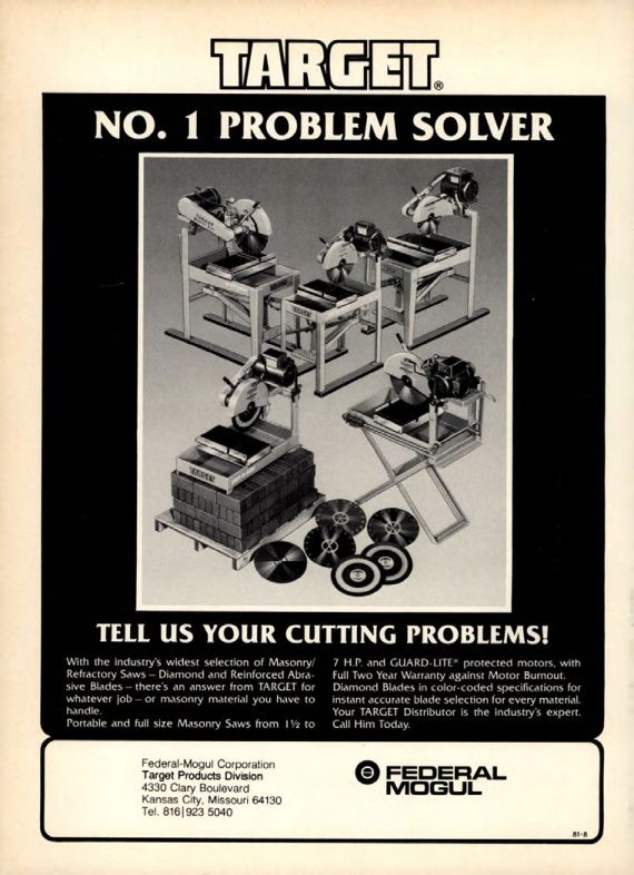 Portable and full size Masonry Saws from 1½ to 7 H.P. and GUARD-LITE* protected motors, with Full Two Year Warranty against Motor Burnout. Diamond Blades in color-coded specifications for instant accurate blade selection for every material. Your TARGET Distributor is the industry's expert. Call Him Today.