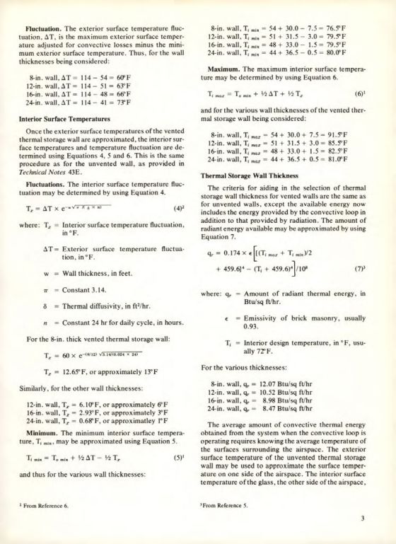 Once the exterior surface temperatures of the vented thermal storage wall are approximated, the interior surface temperatures and temperature fluctuation are determined using Equations 4, 5 and 6. This is the same procedure as for the unvented wall, as provided in Technical Notes 43E.